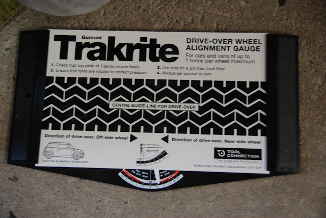 Das Gerät ist geil. es zeigt an wie weit die Spur verstellt ist und man kann entsprechend nachbessern. Man legt das Gerät vor den Reifen, fährt drauf und dabei zeigt das Gerät den Winkel der Spur an.